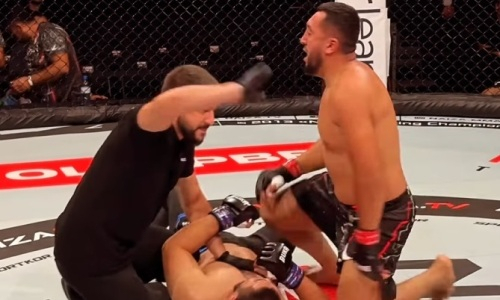 Этот поединок прошел в тяжелом весе и был рассчитан на три раунда, но не продлился всю отведенную дистанцию: Халилов одержал досрочную победу уже в первом раунде — боец из Узбекистана успешно провел удушающий прием, после которого казахстанцу пришлось сдаться. Видео финиша можно посмотреть ниже.