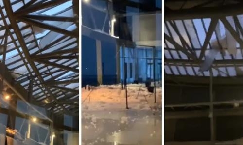 На кадрах видно, что стеклянные вставки на крыше комплекса не выдержали снега и льда и в итоге просто разбились, обрушившись на пол.