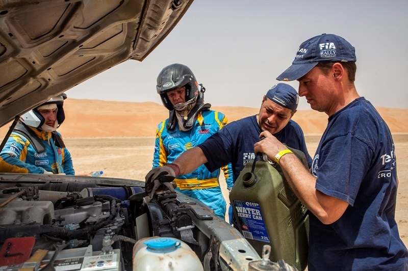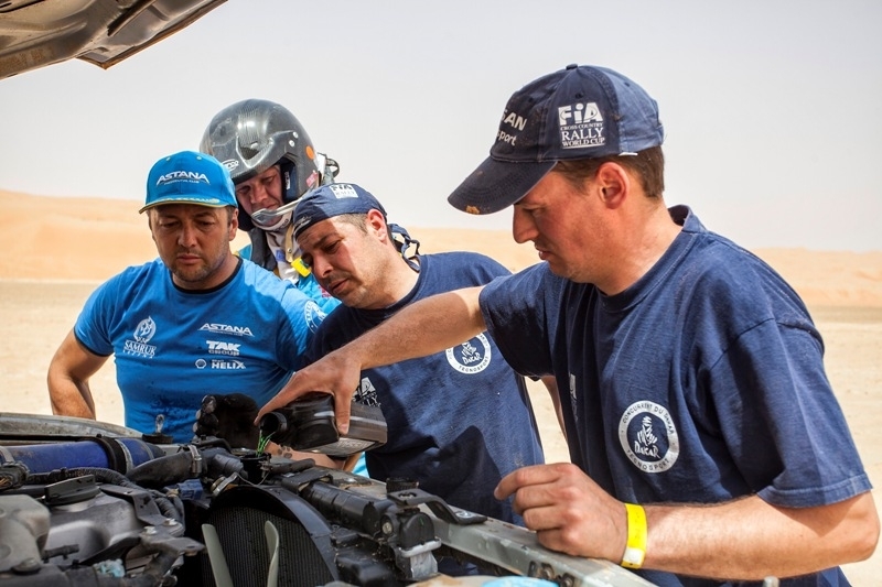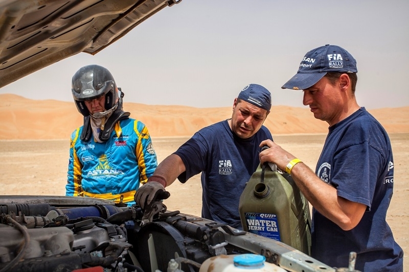 — Вчера нам заменили глушитель, и уже со старта мы заметили, что что-то не так с мотором, не хватает тяги, — делится впечатлениями о прошедшем этапе пилот Astana Motorsports Денис Березовский — Пришлось по ходу гонки адаптироваться к такой неисправности машины. Т. е. на дюны с привычной скоростью забираться уже не удавалось, приходилось разгоняться сильнее, чем обычно. Но, несмотря на этот сбой, к которому мы быстро приспособились, первые километров сто шли хорошо и даже обогнали экипажи, идущие на второй и первой позиции в категории Т2. Где-то на 130-м километре, пытаясь заехать на высокую дюну, разогнались слишком сильно, перепрыгнули через кромку и попали в двойную дюну. Сильно ударившись носом в песок, пробили радиатор. Благо, техническая помощь сработала оперативно, быстро привезли все необходимые запчасти и исправили поломку. Мы сообщили наши координаты и к приезду механиков уже разобрали машину. Невзирая на то время, что мы потратили на ремонт машины, а это почти два часа, свое «бронзовое» место мы все же сохранили. Вдобавок ко всему, сегодня еще стояло адское пекло. По прогнозам обещали 37-39 градусов Цельсия, но в пустыне столбик термометра показывал все 46!