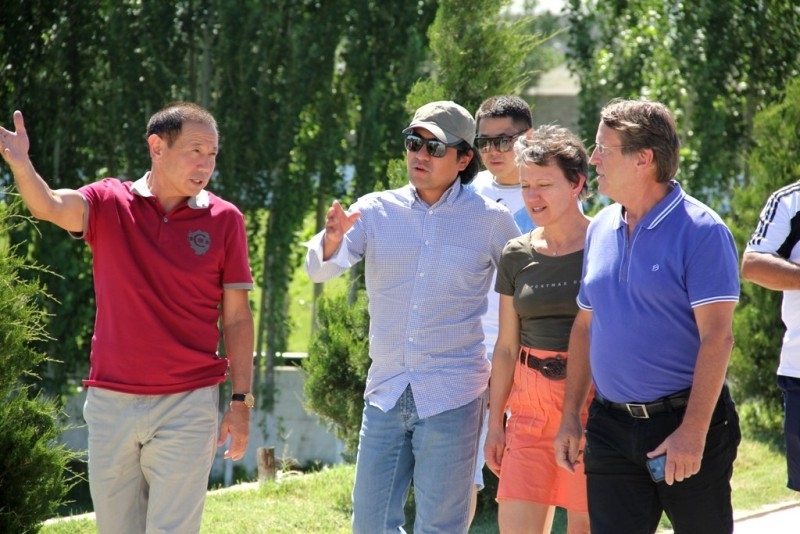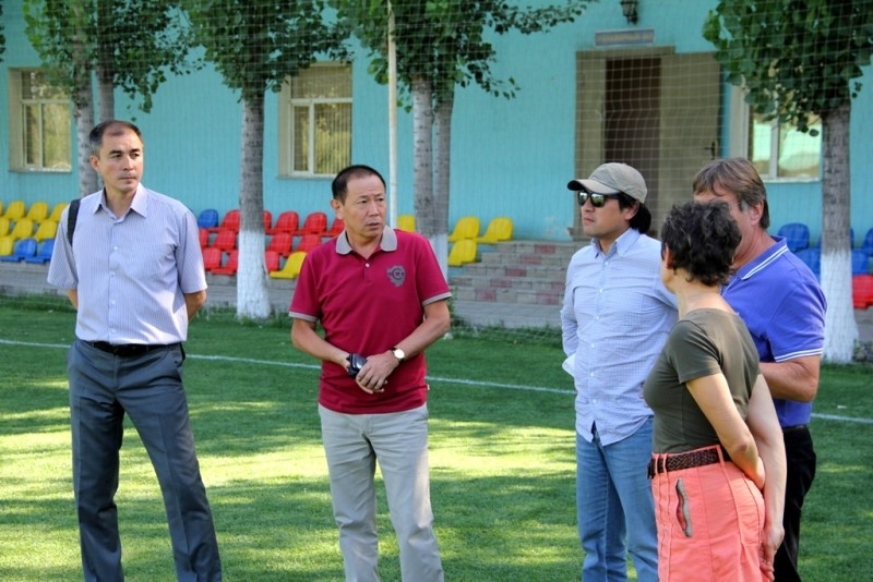 После обеда делегация ознакомилась с объектами футбольного клуба «Ордабасы». Сначала гости посетили загородную базу клуба, строительство которой закончено совсем недавно. Членам делегации показали жилой корпус базы, два маленьких футбольных поля и одно большое.