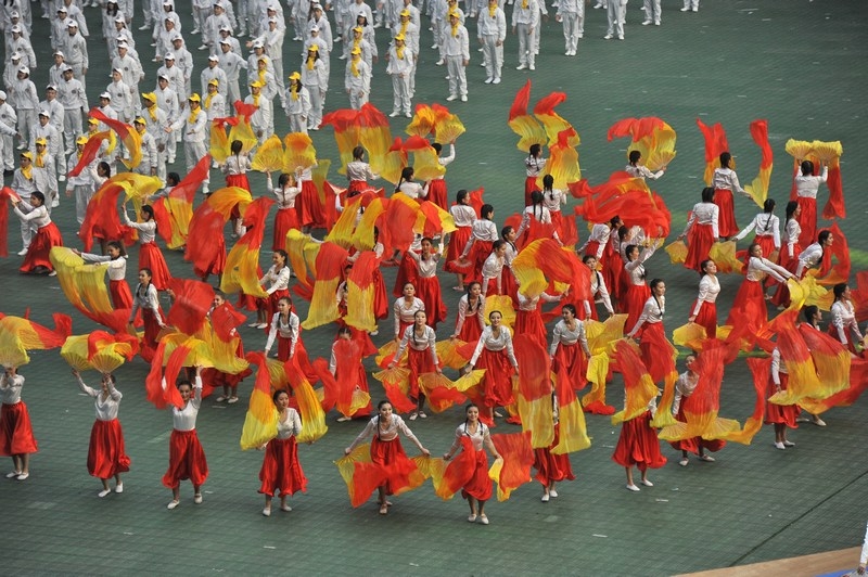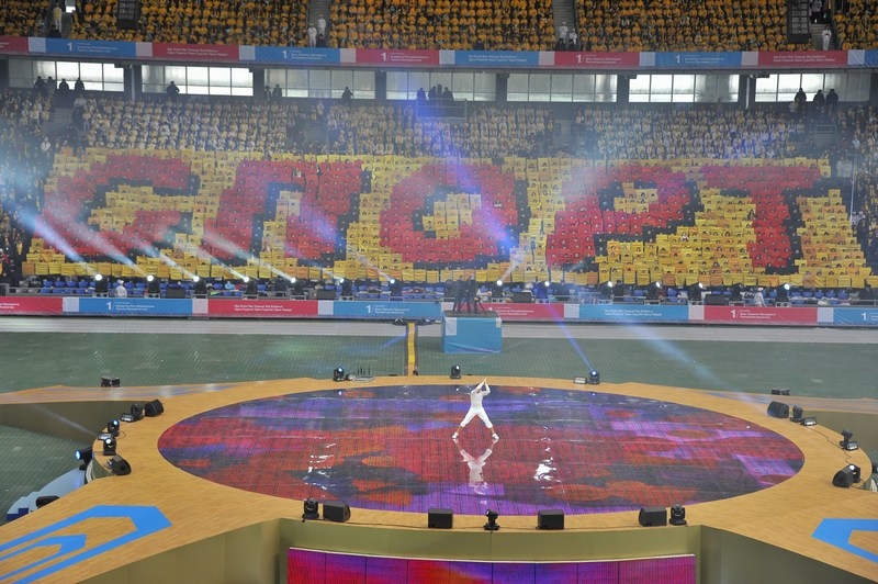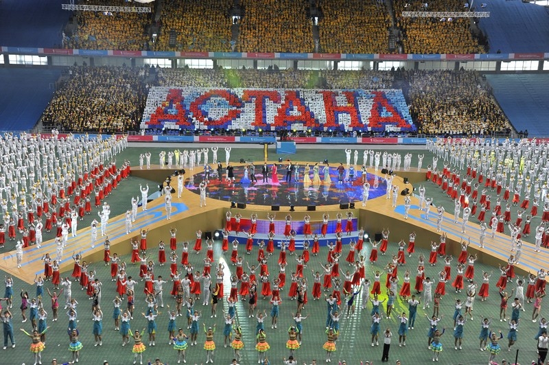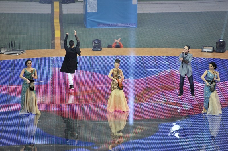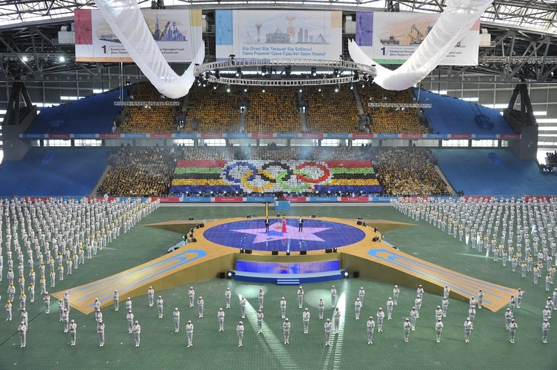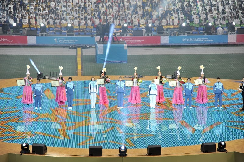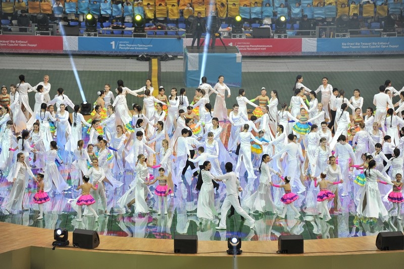 Отдельной строкой стоит отметить перфомансы расцвеченными флажками на зрительских трибунах, которые с поразительно точностью передавали настроение праздника, вырисовывая спортивные и олимпийские символы, выписывая ключевые слова. На трибунах создавались целые композиции в виде флага Казахстана, карты страны, и др. Ведущие артисты Казахстана исполняли слова на патриотическую тематику, к примеру, группа «Ринго» исполнила специально подготовленную к этому событию композицию о спорте. Каждая песня сопровождалась представлением артистов на поле.