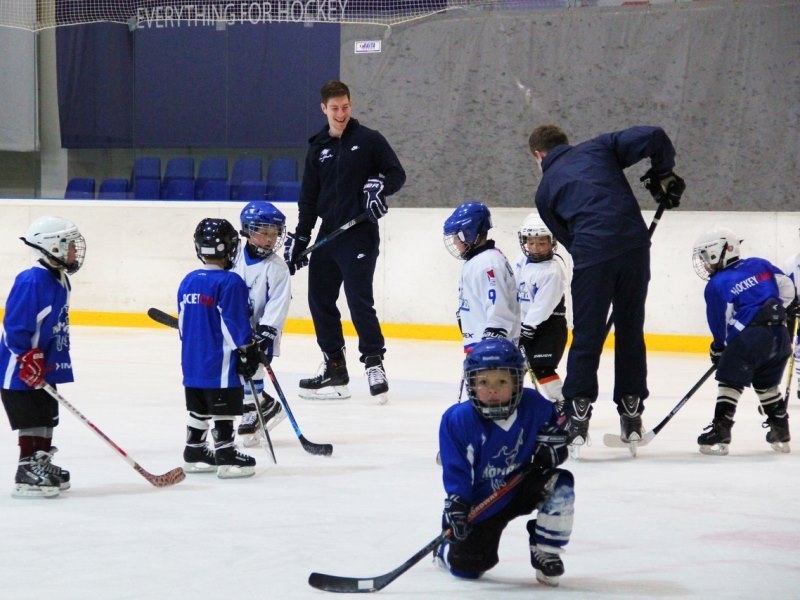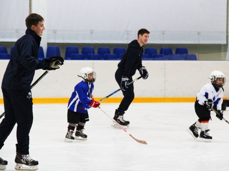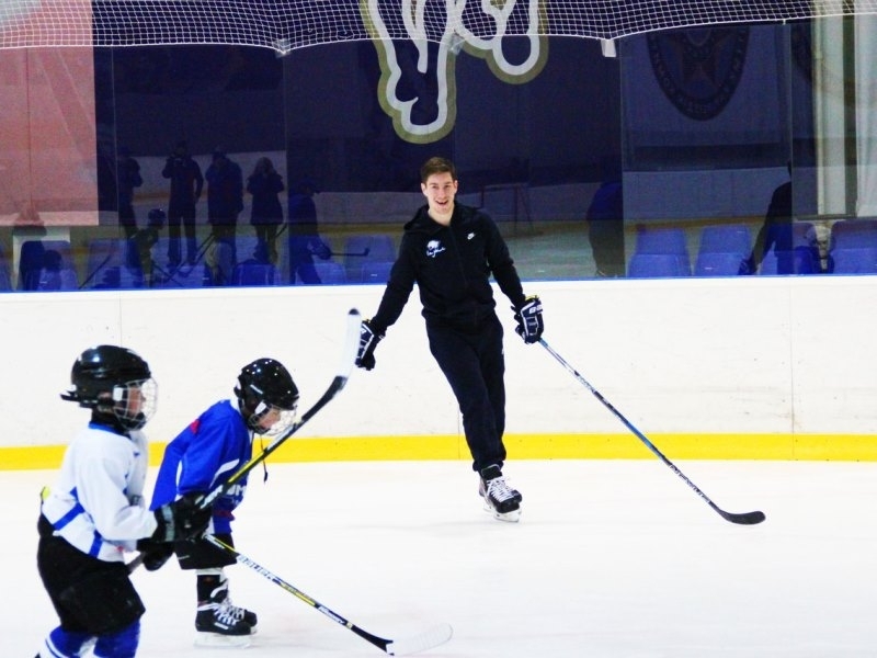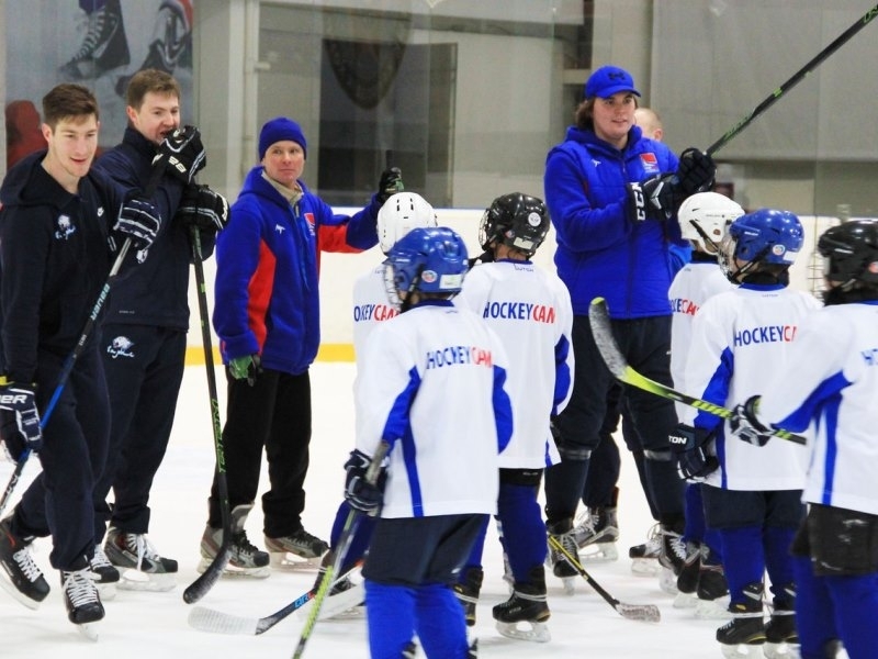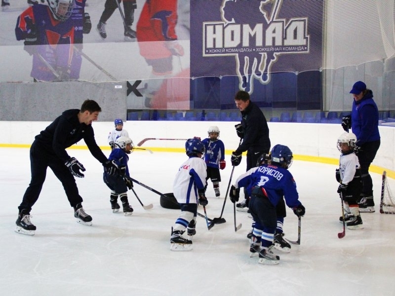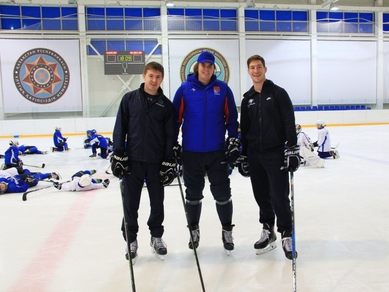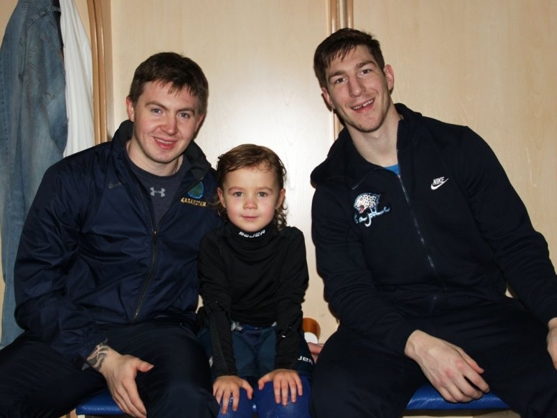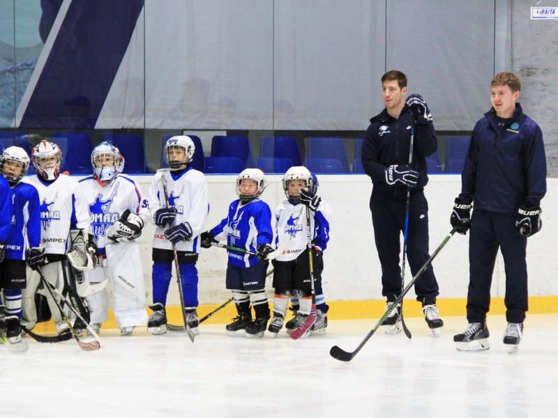 Игроки астанинского «Барыса» Даррен Диц и Антон Сагадеев во время перерыва в регулярном чемпионате КХЛ провели мастер-класс для юных воспитанников столичного клуба.