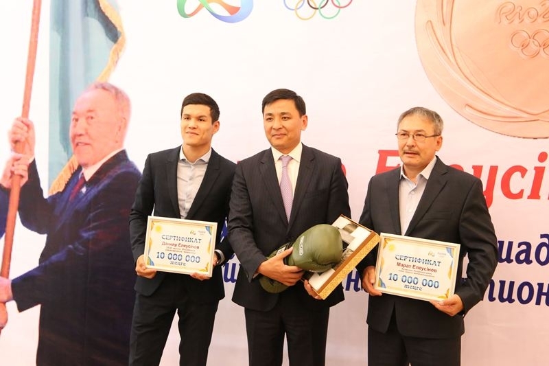 Затем А.Кульгинов вручил Д.Елеусинову и М.Елеусинову по сертификату на 10 миллионов тенге каждый.