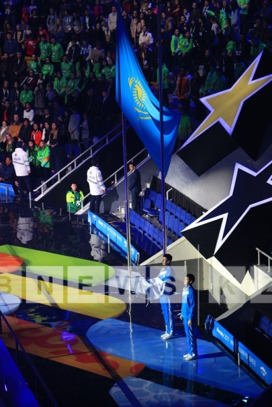 После чего аким Алматы Бауыржана Байбек передал флаг Всемирной Универсиады мэру г. Красноярска РФ Эдхаму Акбулатову, который, в свою очередь, поблагодарил руководство Алматы и Казахстан за гостеприимство.