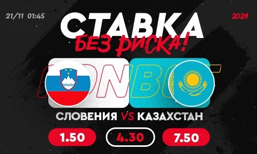 Сделай ставку от 4000 тенге на победу Казахстана в основное время в матче Словения — Казахстан БЕЗ РИСКА. В случае проигрыша тебе вернется 100% от суммы ставки в виде бонуса на бонусный счет.
