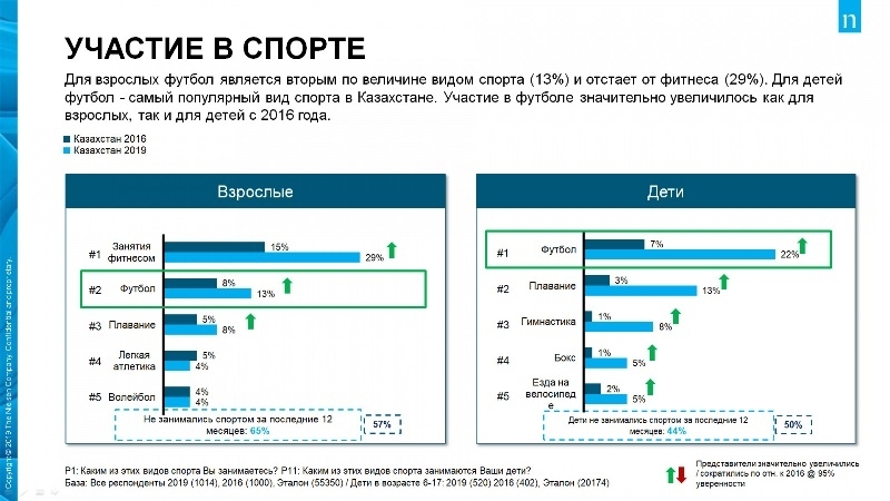 Также футбол среди взрослого населения занимает второе место по вовлеченности после фитнеса (13 процентов в 2019 году против 8-ми в 2016 году). Резко возросло и количество занимающихся футболом среди подрастающего поколения (22 процента против 7-ми). По этому показателю футбол у детей заметно превосходит плавание и гимнастику (13 и 8 процентов соответственно).