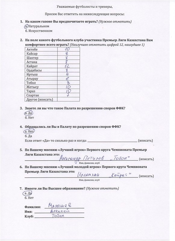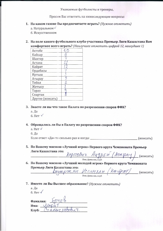 Конечно, одним из главных вопросов стало качество полей в чемпионате страны. Так статистика показала, что 100 процентов опрошенных хотят играть только на натуральных полях. По мнению, казахстанских футболистов лучшее поле в нашей стране в Алматы. Второе место по качеству газона заняла «Астана-Арена», однако, важно отметить, что столичное поле сильно уступило лидеру опроса, набрав лишь 12%, в то время, как у Центрального стадиона Алматы 85%. Тройку замкнуло поле в Актобе.