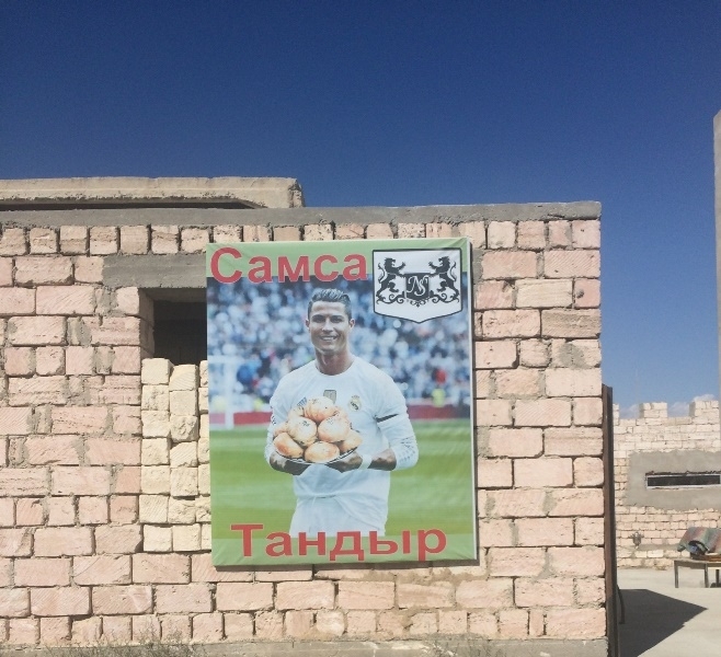 Звёзды футбола, нападающий ФК «Барселона» Лионель Месси и Криштиану Роналду из ФК «Реал Мадрид» рекламирует тандырную самсу в одном из посёлков Мангистау, передаёт «Лада».