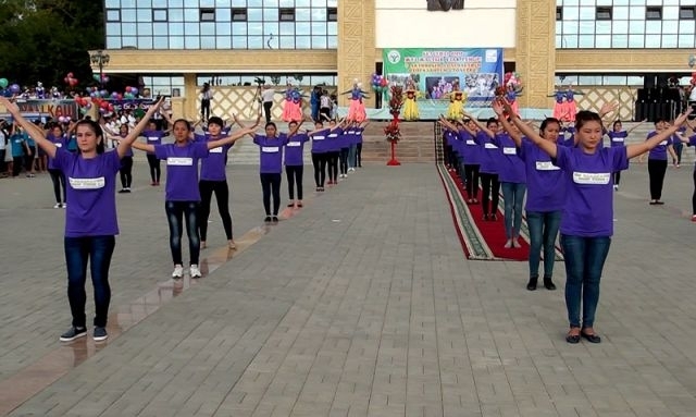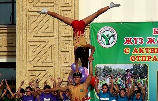 Бурными овациями участников встретили на главном торжестве. Перед театром имени Ж.Шанина в это время начался флешмоб. Под веселую музыку школьники и студенты выполняли несложные упражнения, призывая горожан ежедневно делать утреннюю зарядку.