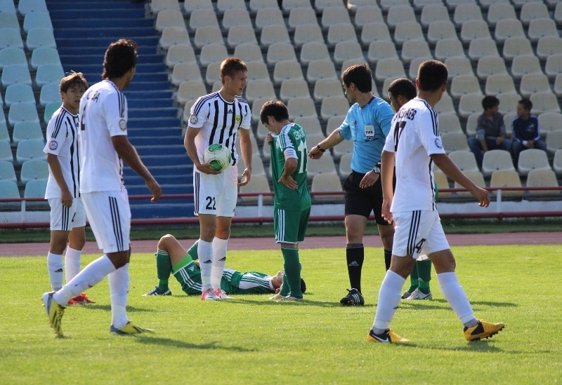 После получаса борьбы гол все-таки забит. Но забит не в ворота гостей, как ожидалось,— костанайцы сами распечатали свои ворота. После навесной передачи Бейсембаев, Круглов и Лебедев не разобрались, кто должен «заиграть» этот мяч. Ерлан выбивает мяч головой, но наш кипер уже вышел за мячом и что называется, получил «за шиворот» — 0:1.