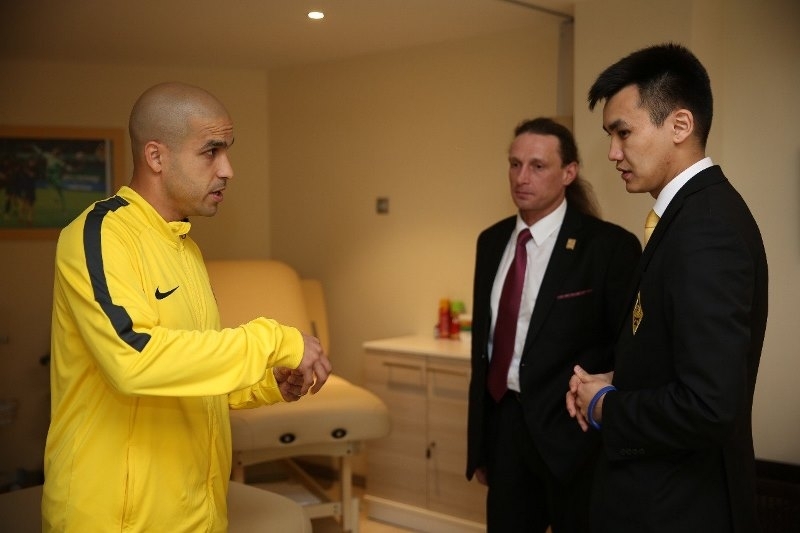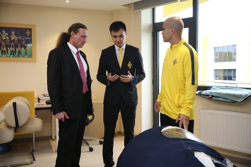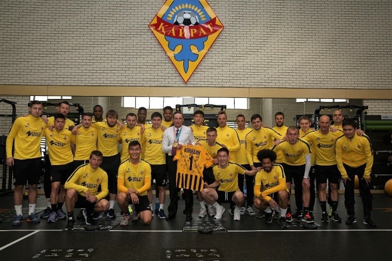 После проведенной экскурсии для спортсмена, Колядин познакомился с основной командой клуба. Футболисты были рады встретить Александра, который отметил, что такое командное единение — один из залогов успеха любого коллектива. После живого общения, капитан команды Бауыржан Исламхан вручил от лица всей команды игровую футболку алматинского клуба, с подписями всех игроков «Кайрата» и пожелал спортсмену дальнейших успехов на международной арене.