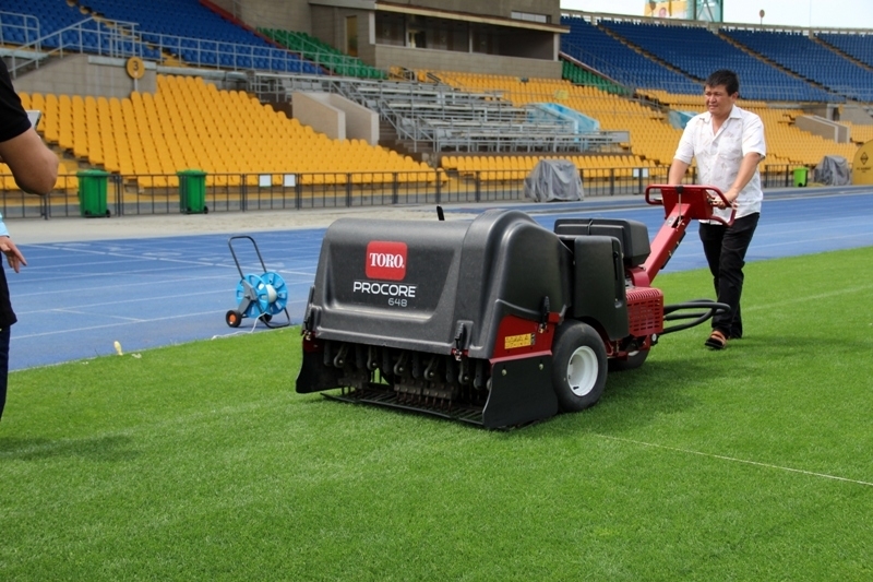 На примере полей стадиона «Центральный» и учебно-тренировочной базы ФК «Кайрат» Виктор Яроменко продемонстрировал наиболее доступные и действенные методы по уходу за натуральными футбольными газонами.