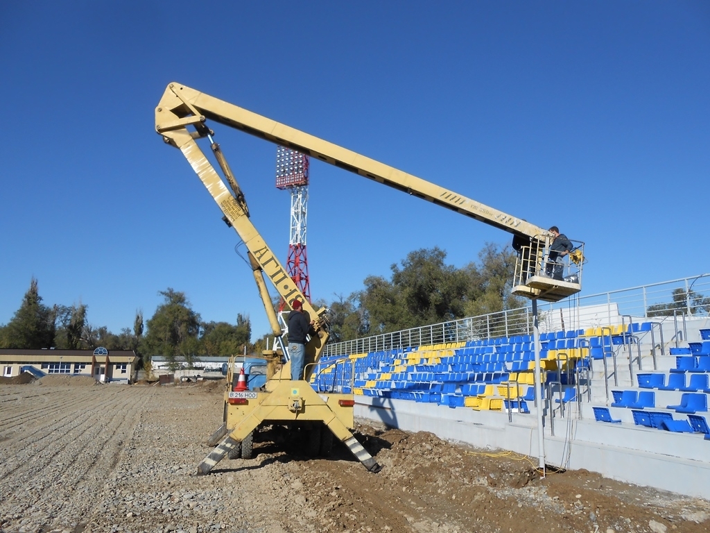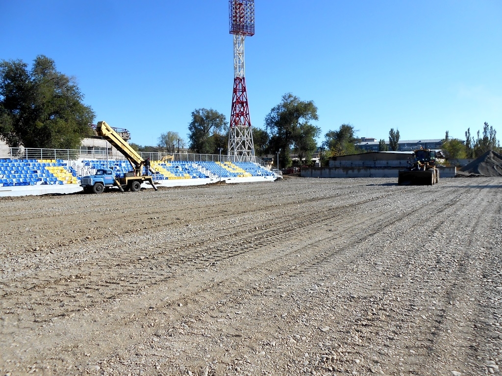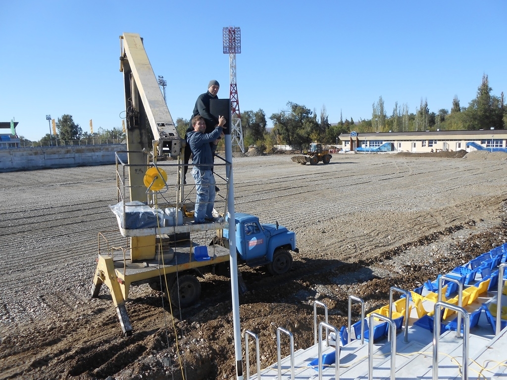 В эти дни здесь работают более 60 человек и занимаются подготовкой футбольного поля, где будет застелено искусственное покрытие с подогревом по итальянской технологии. На сегодняшний день установлены четыре осветительные мачты, на которых размещены по 40 прожекторов на каждую, завершается установка пластиковых сидений, а также благоустройство территории.