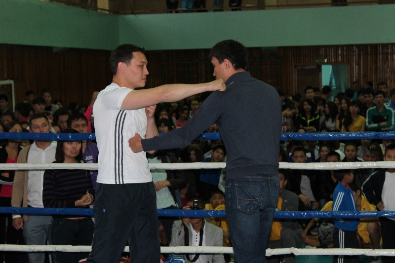 Завершив мастер-класс, чемпион предложил товарищеский спарринг. Однако никто кроме Санжара Бокаева так и не рискнул принять вызов чемпиона. На глазах у изумленных студентов они вышли на ринг и отработали три полноценных раунда. В результате победила дружба.