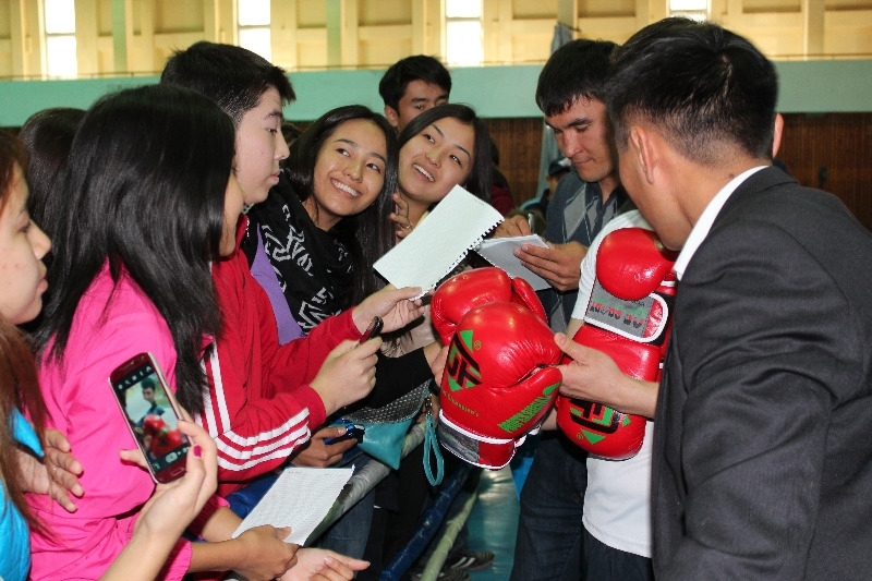 Управление по вопросам молодежной политики организовало встречу чемпиона мира по боксу Серика Сапиева со студенческой молодежью города Алматы в спорткомплексе КазНУ им. аль-Фараби.