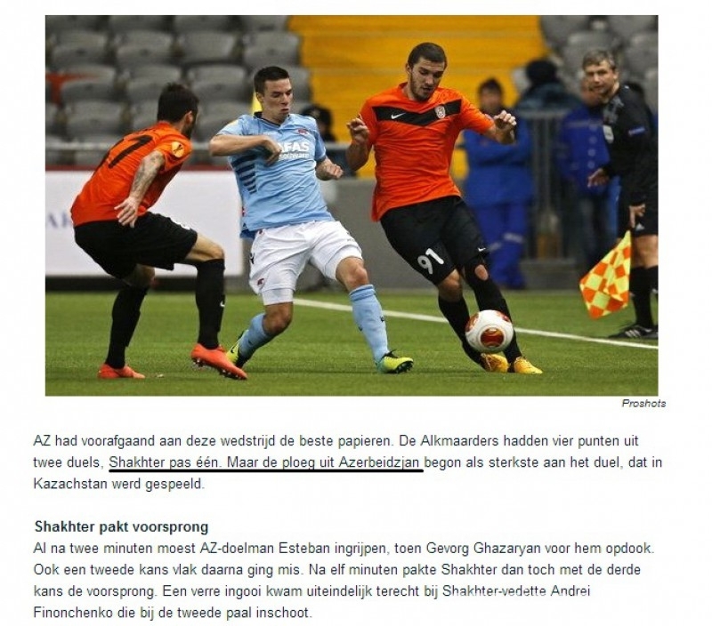 Как передает «azerisport.com», ряд голландских СМИ отметили, что карагандинский клуб является представителем Азербайджана, как до игры, так и после нее, несмотря на то, что встреча между «Шахтером» и голландским «АЗ Алкмааром» (1:1) прошла в столице Казахстана — Астане.