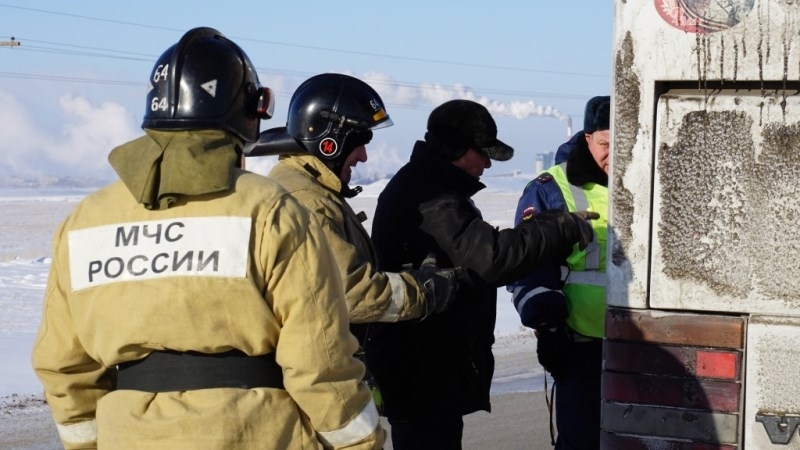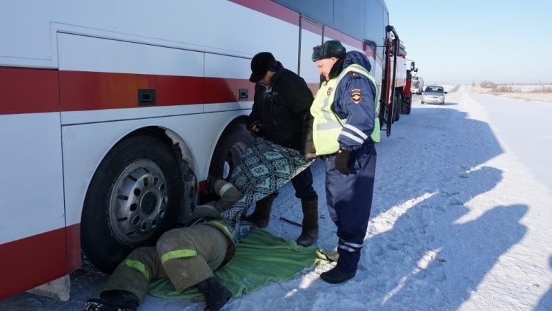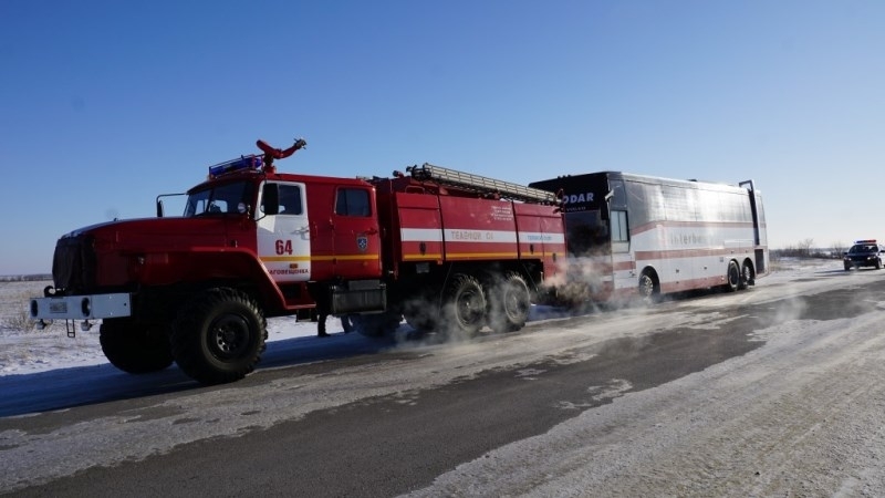 Автобусом занимались сотрудники МЧС, ГИБДД и водители. ОАО «Кучуксульфат» предоставило теплый бокс, куда на жесткой сцепке отбуксировали ТС.