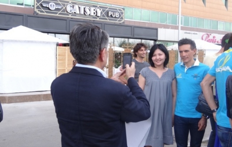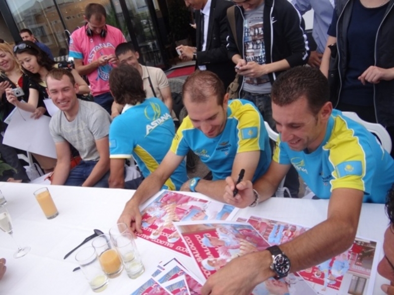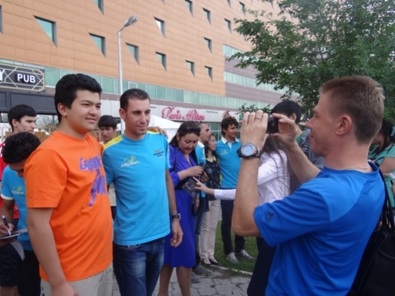 Сегодня казахстанская велокоманда «Астана» во главе с победителем «Джиро д’Италия-2013» Винченцо Нибали провела встречу с болельщиками в столице. Фанаты «Астаны» получили возможность сфотографироваться со своими кумирами и взять автографы у триумфаторов большой итальянской многодневки. Звезды были очень открыты в общении и не отказали никому в автографе.