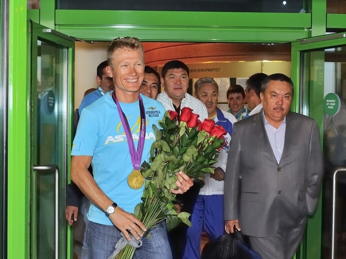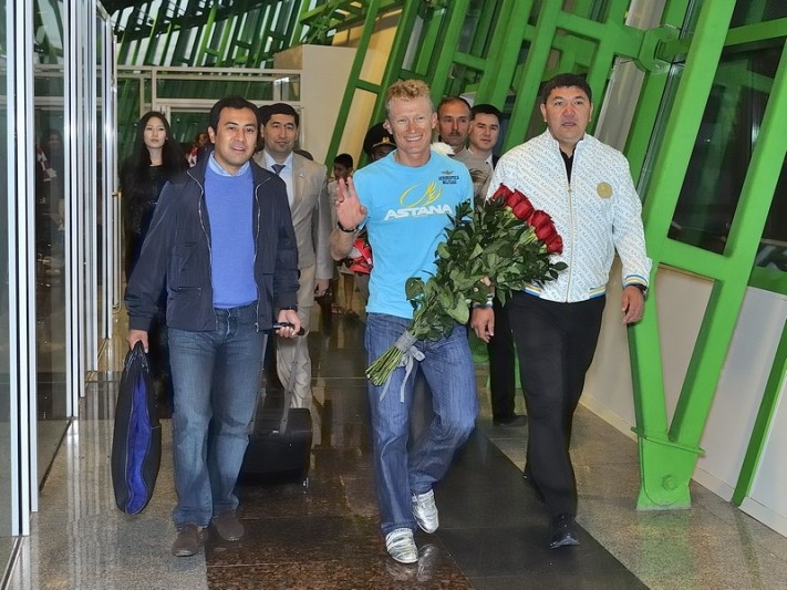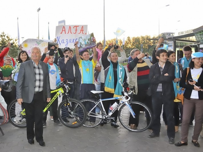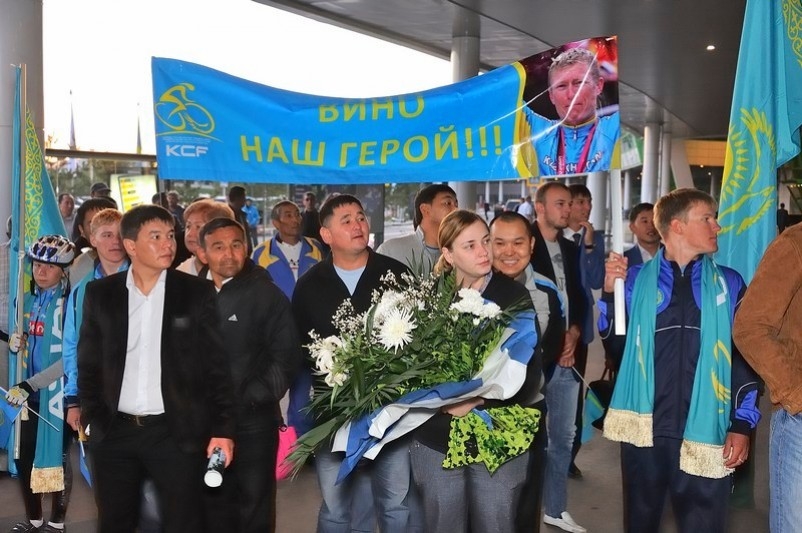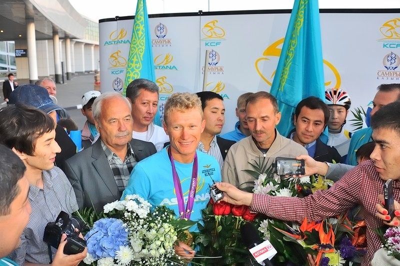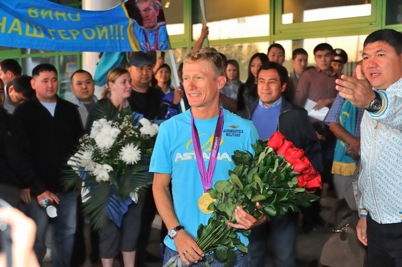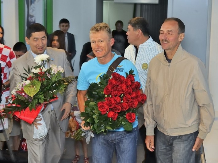 Первым завоевав олимпийское «золото» для Казахстана, Александр Винокуров самым последним из чемпионов ступил на родную землю. Сегодня ранним утром олимпийского чемпиона, самого известного велогонщика нашей страны встречали в международном аэропорту «Астана». Помимо представителей Федерации велоспорта РК, поприветствовать спортсмена приехали самые преданные его поклонники — юные велогонщики, воспитанники спортивной школы, а также поклонники таланта Вино.