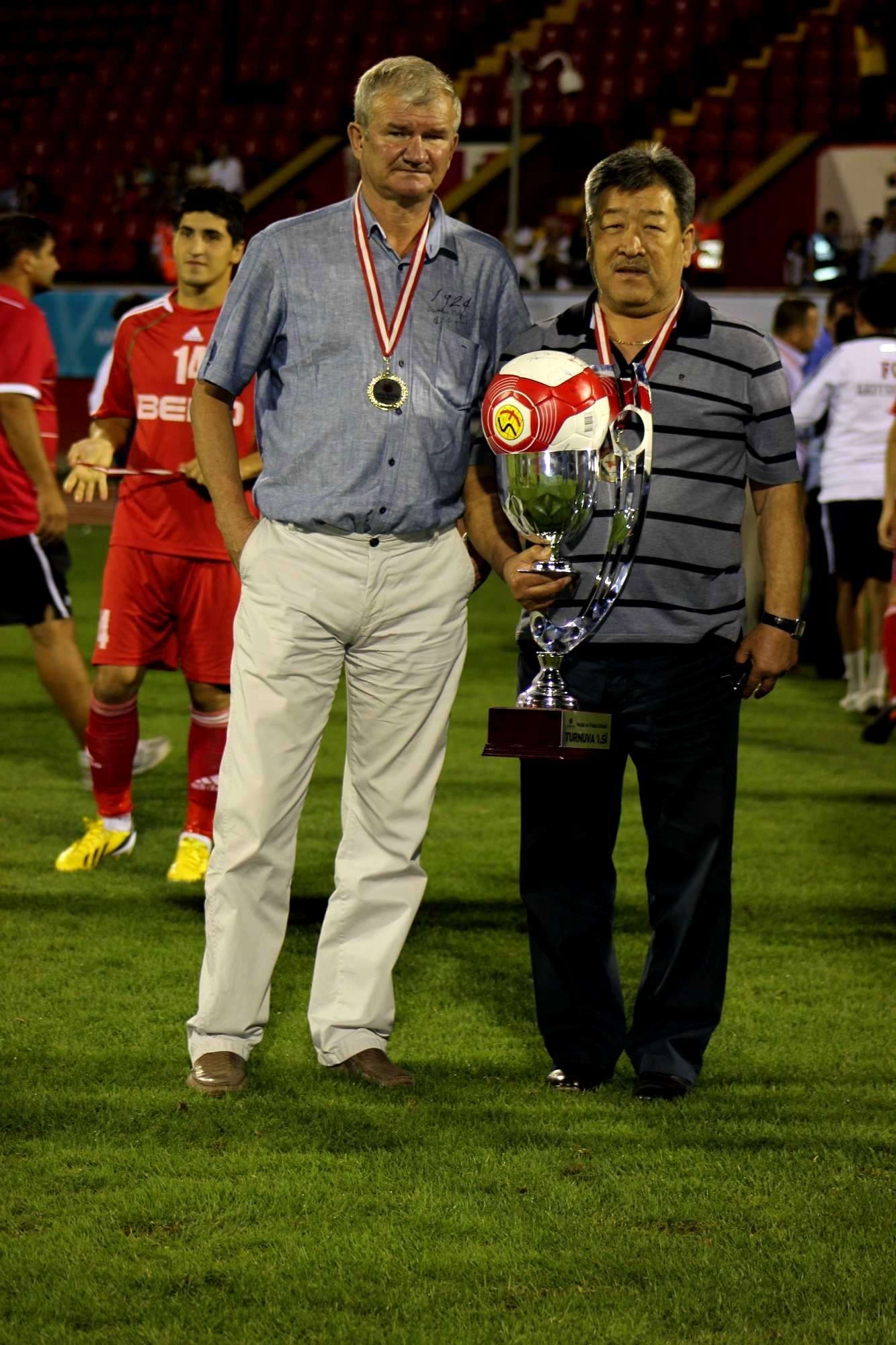 Всех участников турнира лично награждали руководители городской админстрации. Сначала командам были вручены памятные подарки. Затем призеры и победители получили свои заслуженные медали и Кубки. Самый большой Кубок естественно был под громкие аплодисменты болельщиков усть-каменогорскому «Востоку»! Красочный салют в честь победителей и участников турнира и фотосессия. Многие болельщики остались на трибунах что называется до последнего, и футболисты «Востока» отблагодарили их «сувенирами» в виде своих игровых футболок!